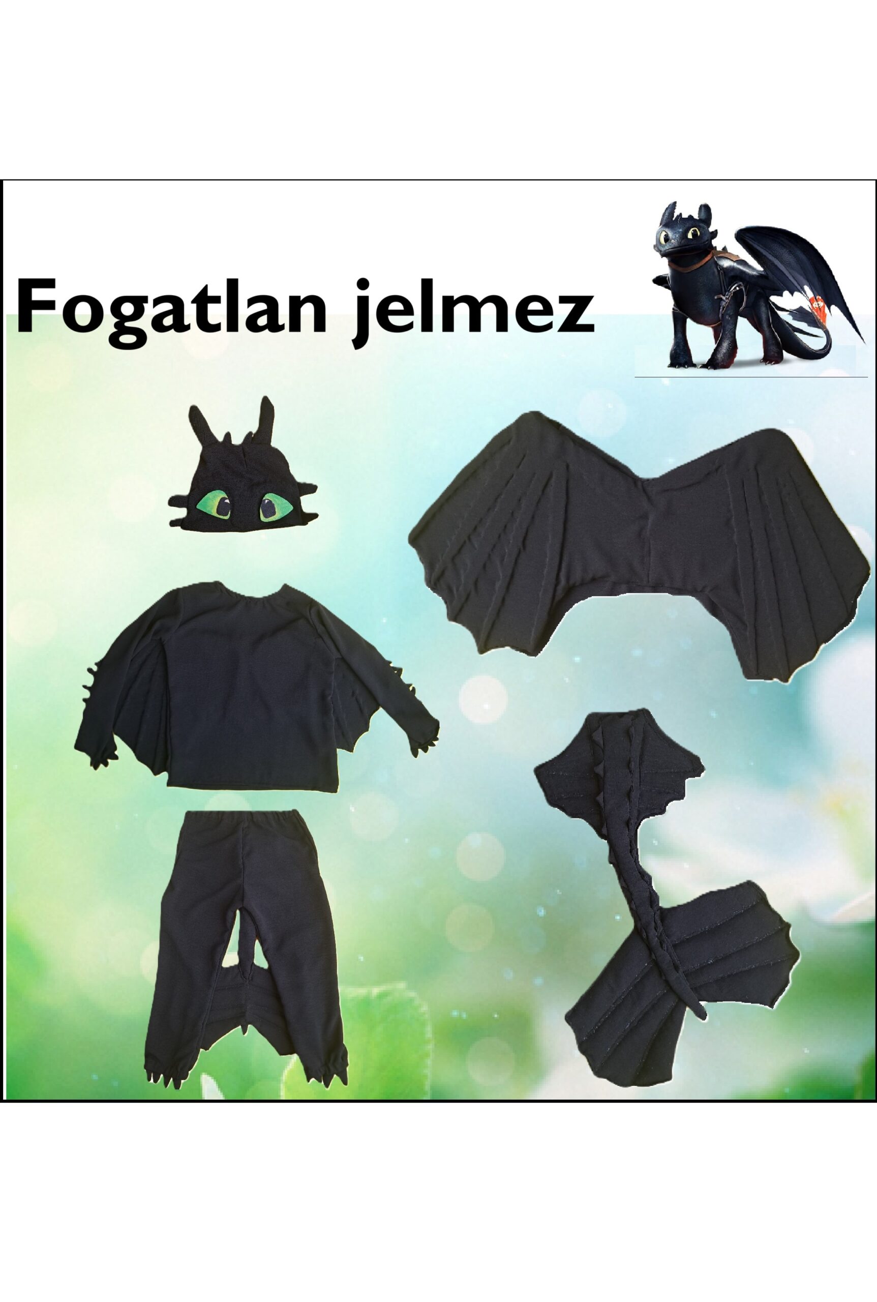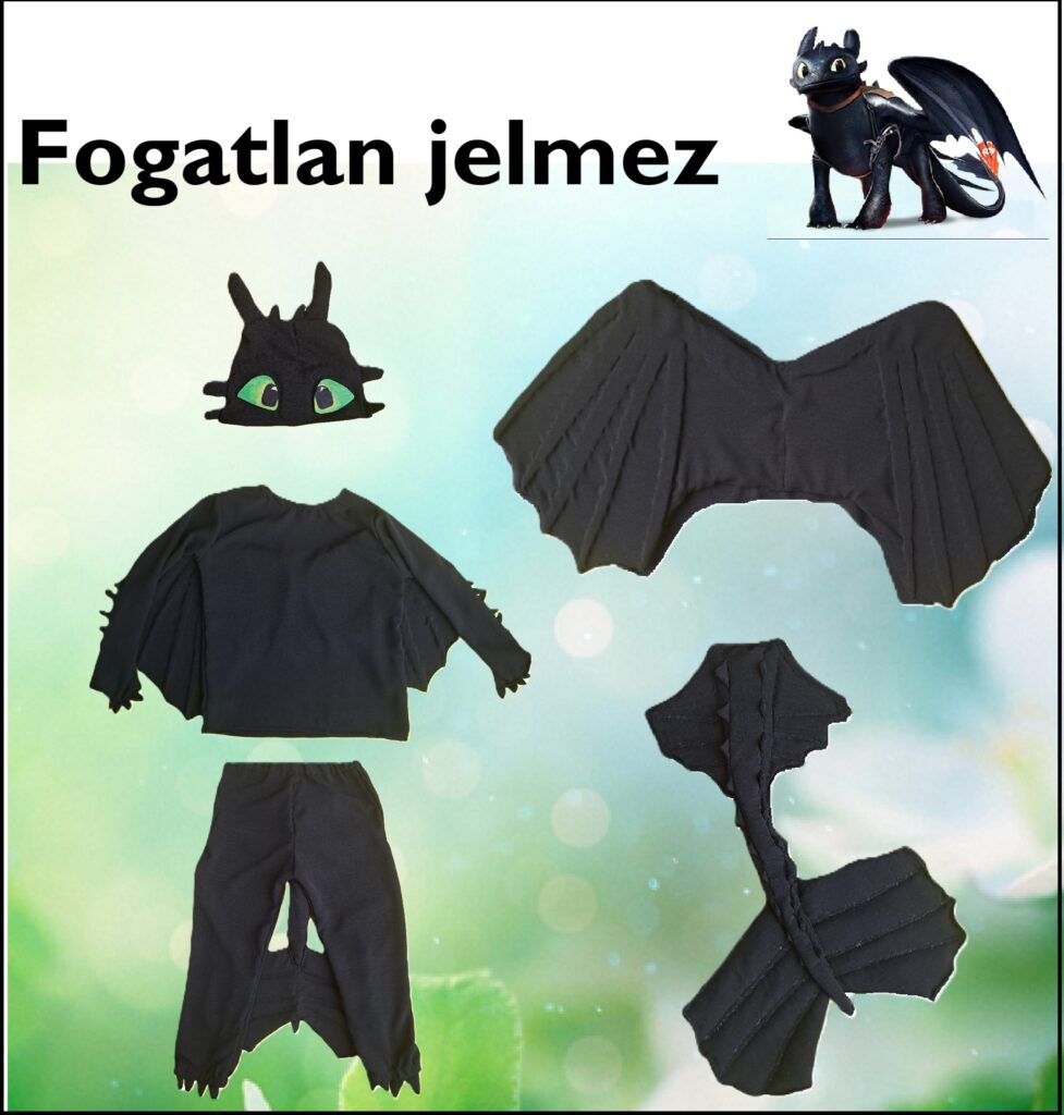 Fogatlan jelmez óvodásoknak. Hosszú ujjú felsőrész, hosszú nadrág és sapka. A ruhára fel van varrva az élethű szárny és a farok. Drótmentes, puha szivacsból készültek a kiegészítők.