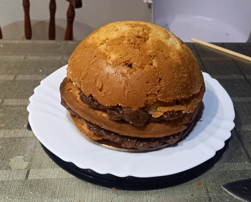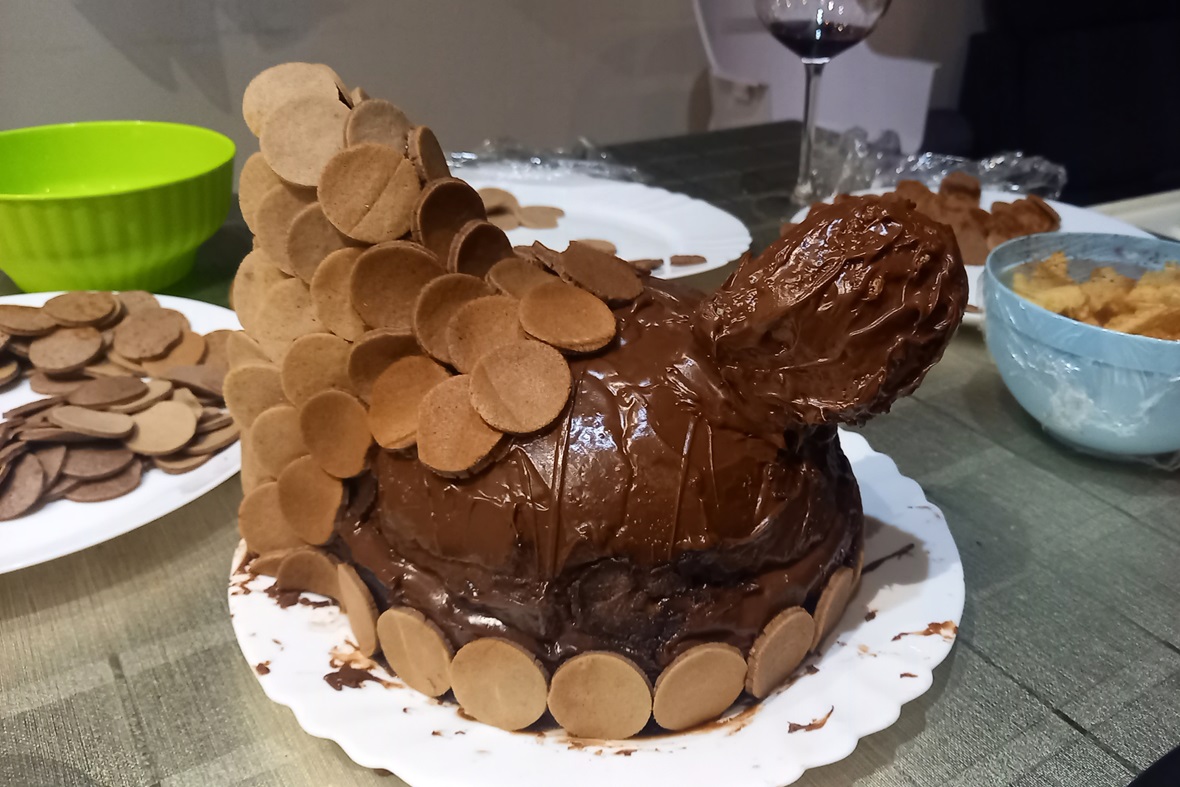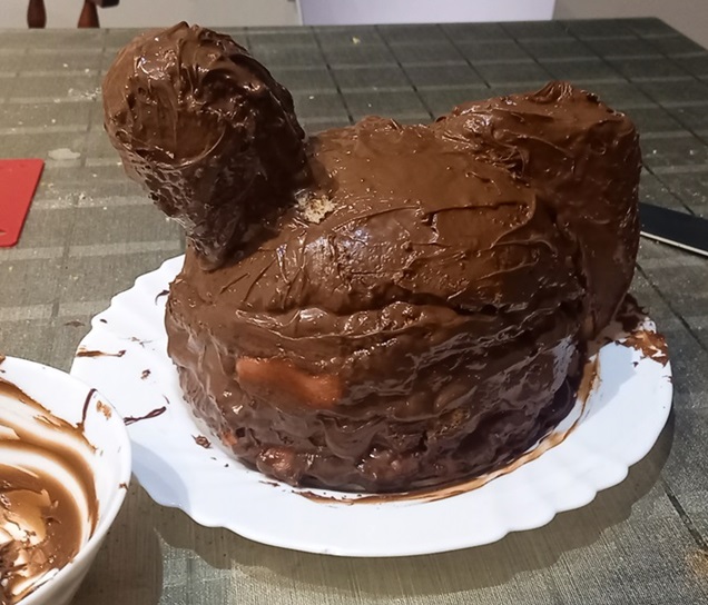 - Csirke alak összeállítása egy kör alakú formában sütött tortalapból + egy kisebb torta amit formára vágunk a farkának és a fejének.