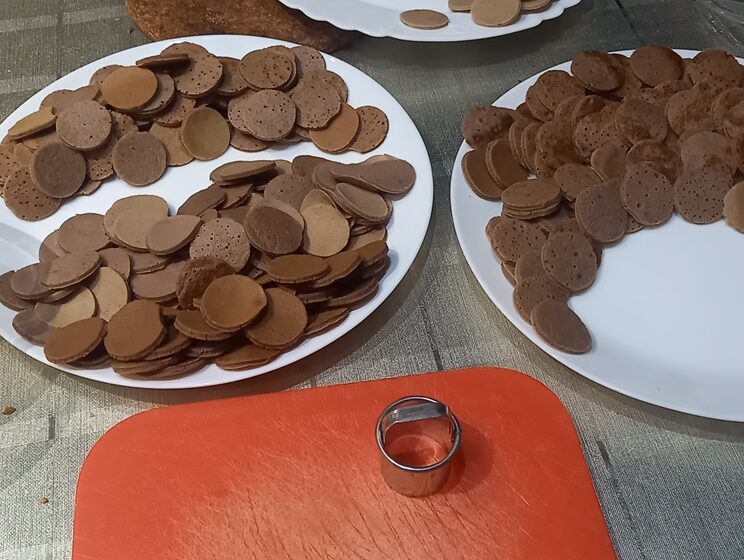 - A korongokhoz kakaós palacsintát sütöttem. Lehet variálni a tésztában a kakaó mennyiségét, így különböző barna árnyalatokat kapunk. Kicsit vastagabbra sütöttem a palacsintákat és kör alakú kiszúró formával gyorsan legyártottam a tollazatot.